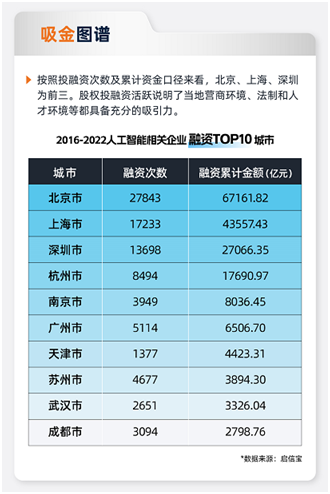 AI市場的高速發展與資本的助力息息相關。就城市而言,北京、上海、深圳、杭州、南京的“吸金”能力最強。啟信寶產業鏈數據庫統計了2016年至2022年間,城市投融資次數及累計金額,北京以2.7萬余次融資,累計金額67萬億人民幣位居榜首;其次是上海,融資次數1.7萬余次,累計金額超43萬億人民幣?;钴S的融資動態充分體現了相關區域AI產業的吸引力,為行業的進一步發展注入了活力。(企業供圖)