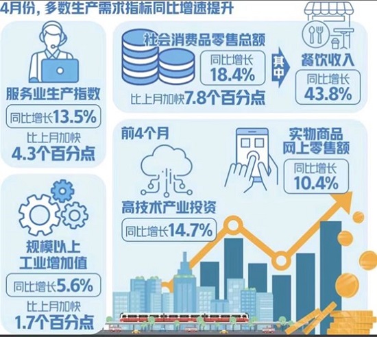 中國網商務頻道注意到,4月經濟運行主要指標增速多數有所加快。其中最為引人矚目的是,前期受到壓抑的服務需求繼續釋放,尤其接觸型、聚集型服務業回升明顯。