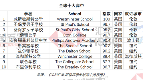 胡潤百富旗下國際教育平臺胡潤百學聯合匯豐近日在上海發布《2023匯豐·胡潤百學全球高中排行榜》(HSBC Hurun Education Global Highschools 2023),列出了全球頂尖非公立高中,榜單根據畢業生去向、課外活動和學校聲譽進行排名。這是胡潤百學首次發布該榜單。