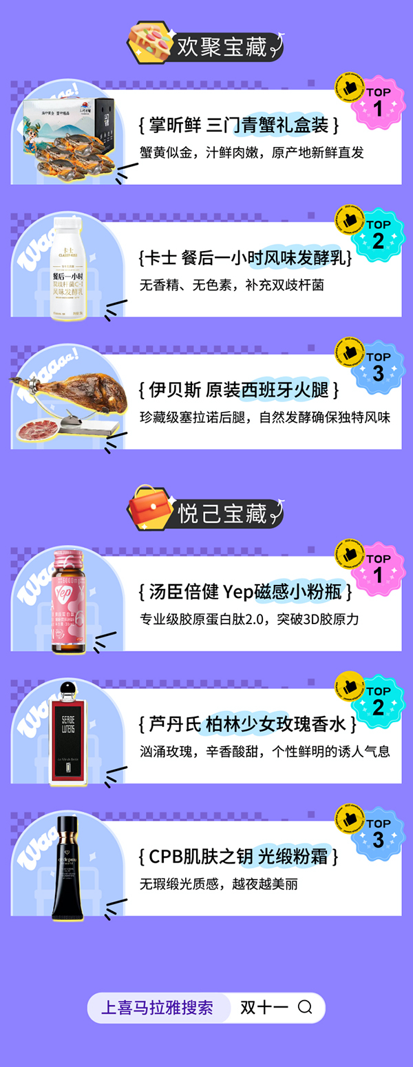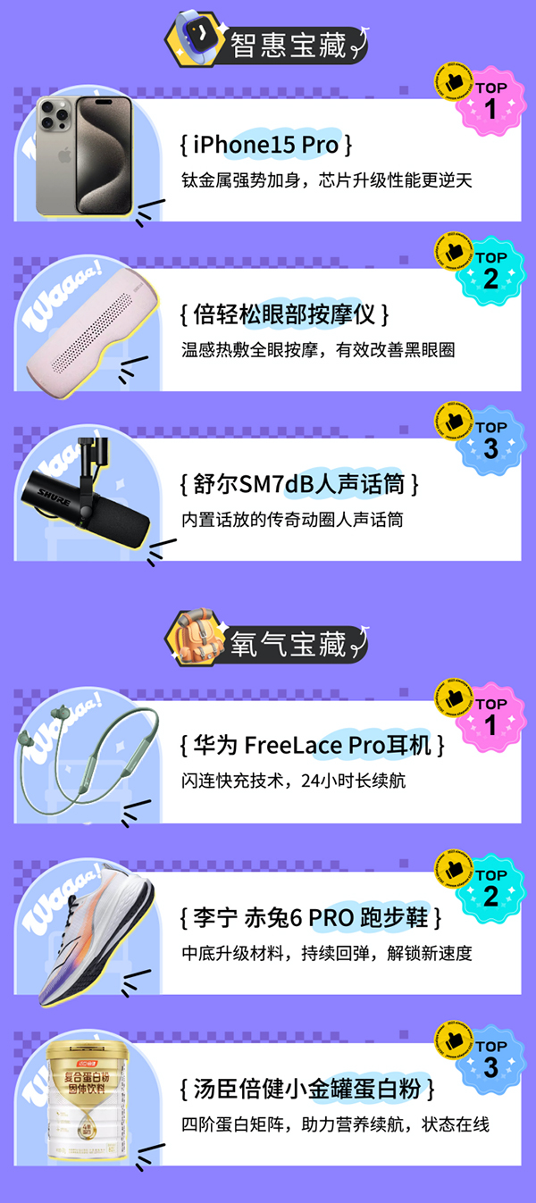在“智惠寶藏”中,上榜Top3的寶藏好物為:iPhone 15 Pro、倍輕松眼部按摩儀、舒爾SM7dB人聲話筒,科技可以讓我們的生活變得更舒適、美好。在“氧氣寶藏”中,上榜Top3的寶藏好物是:華為FreeLace Pro耳機、李寧赤兔6 PRO跑步鞋、湯臣倍健小金罐蛋白粉,運動讓我們更健康,好物則讓運動更科學。在“歡聚寶藏”中,上榜Top3的寶藏好物是:掌昕鮮三門青蟹禮盒裝、卡士餐后一小時風味發酵乳、伊貝斯原裝西班牙火腿,與好友家人相聚,好物是情感的調味劑。在“悅己寶藏”,上榜Top3的寶藏好物是:湯臣倍健Yep磁感小粉瓶、蘆丹氏柏林少女玫瑰香水、CPB肌膚之鑰光緞粉霜,生活再忙,也記得用好物愛自己。如果你恰有所需,可以登錄喜馬拉雅App搜索“雙十一”進入頁面選購。