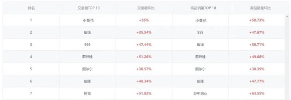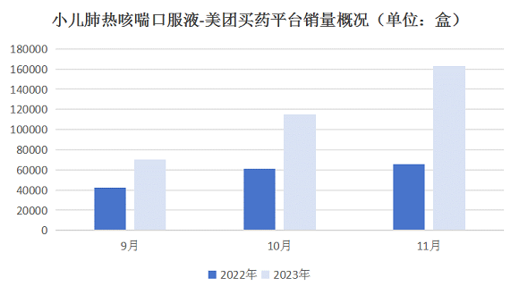 記者梳理發現,美團買藥平臺最新數據也顯示,近期兒童祛痰止咳平喘品類在O2O市場的數據也呈現上漲態勢,以交易額TOP品牌為例,在最近1個月交易額均環比增長30%以上。其中,小葵花品牌交易額、商品銷量均排名第一。此外,美團買藥平臺數據顯示,從9月份起,小兒肺熱咳喘口服液在美團買藥平臺的銷量快速上升,并且逐漸與去年同期拉開差距。截至11月27日,其銷量比去年同期增長了147.85%。
