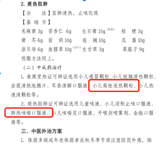 據了解,在北京市新近發布的《2023試行版冬季流感中醫藥防治方案(試行)》中的“兒童流感治療方案”中,針對痰熱阻肺證可辨證選用小兒肺熱咳喘口服液等中成藥物。