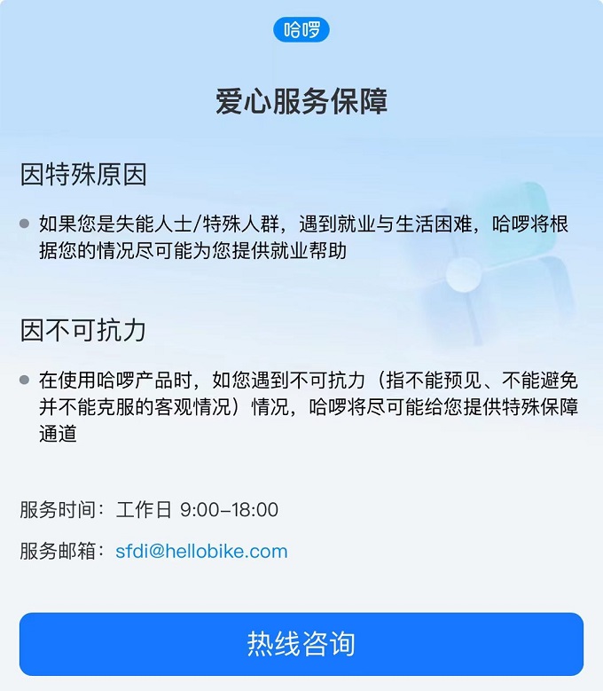 同時,該熱線特別關注兩大類用戶群體:一是在就業和生活中遇到困難的失能人士和特殊群體;二是在使用哈啰服務時遇到不可抗力影響的用戶。有需求的用戶可以發送郵件至sfdi@hellobike.com與哈啰取得聯系,客服團隊將在7個工作日內給予反饋。