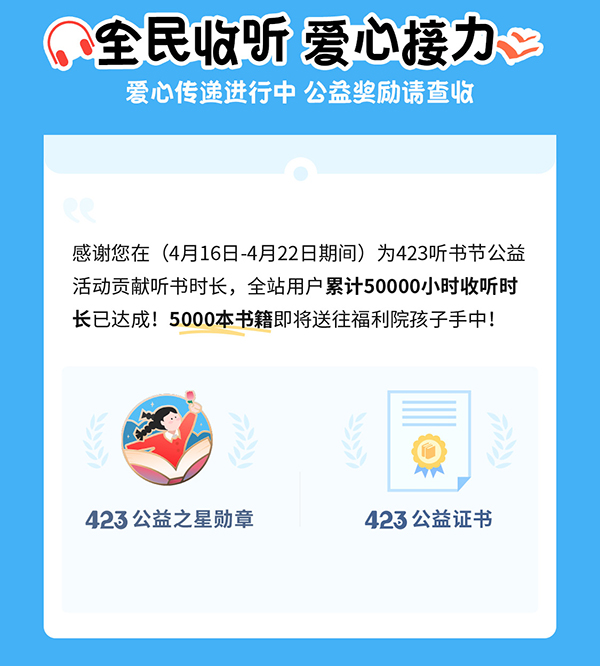 4月16日0:00:00-4月22日19:59:59期間,用戶可在喜馬拉雅App搜索“423公益”,進入“以書之名,讓愛出發”活動頁面,收聽站內任意專輯,加入捐書行動。全站用戶累計完成50,000小時收聽時長后,喜馬拉雅將向春暉媽媽項目支持的多家福利院的兒童捐贈總計5,000本實體書。而參與了活動的用戶可在4月22日20點至4月29日期間,前往“423聽書節”頁面領取“423公益之星勛章”及“423公益證書”,留作紀念。