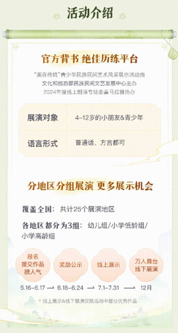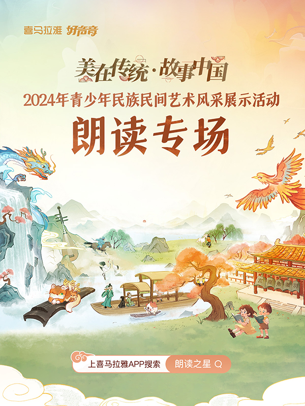 5月16日,由國家文化和旅游部民族民間文藝發展中心主辦,喜馬拉雅協辦的“美在傳統·故事中國——2024年青少年民族民間藝術風采展示活動”朗讀專場線上活動啟動,活動鼓勵廣大青少年用聲音彰顯中國審美旨趣、弘揚中華優秀傳統文化。