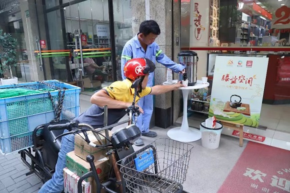 位于芷江西路街道中山北路主干道沿街商鋪的“滕益空間”,服務對象主要為快遞小哥、環衛工人等為代表的戶外工作者,室外的便民茶攤常年擺設,而人大代表也不定期在此接待新業態勞動者。
