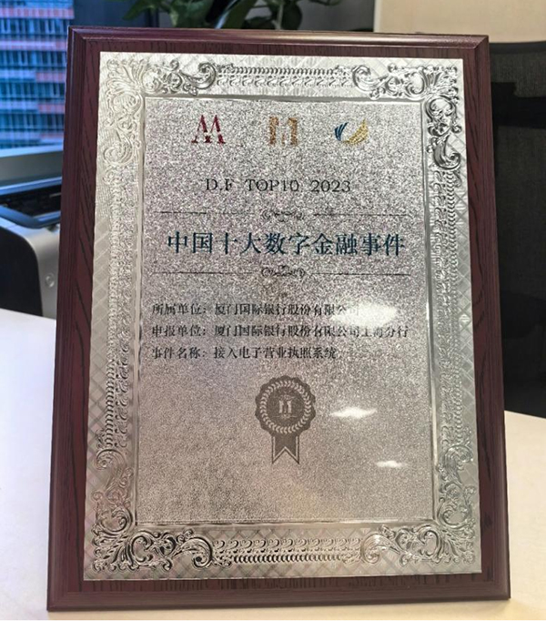 廈門國際銀行上海分行“接入電子營業執照”榮獲中國十大數字金融事件