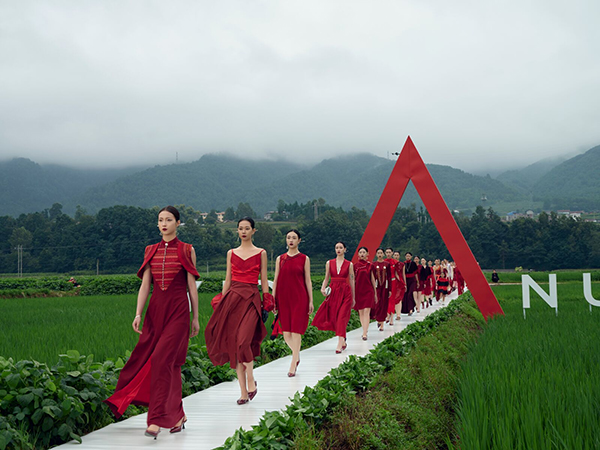 衣迪阿諾2024時裝大秀整個秀場稻香四溢,流水潺潺。在古老的彝族民歌聲中,數十名模特佩戴品牌銀飾、身著首秀作品款款而來,穿越扎根田野的紅色大門,一次次驚艷全場。這是一場將時裝寄情于當地人民生活場景中,融合自然生態、當地文旅、民族藝術于一體的實景大秀。